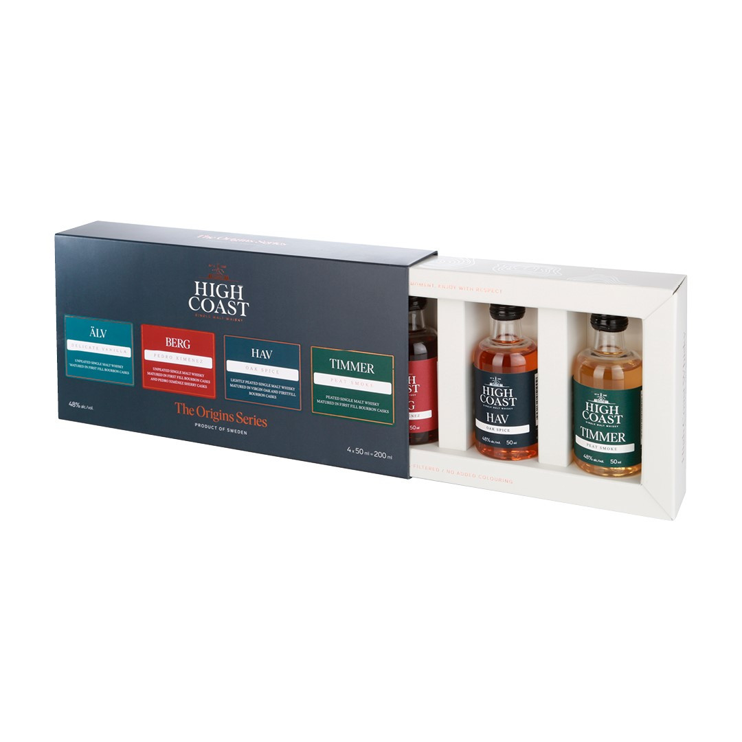 Origins är en serie som bildar basen i vårt utbud av whisky. En serie som står för vårt ursprung. Det är fyra olika uttryck som vi producerar löpande batchvis efter samma recept. Origins är en stolt hyllning till Ångermanälvens strand, där älven möter hav och timret flottats och vidareförädlats i generationer. Origins har fyra olika smakbilder som vägleder dig i grunderna för vårt whiskyspråk. Var och en är en grundpelare, tillsammans är det grunden för High Coast. Här kan du och dina vänner på ett enkelt sätt prova alla fyra samtidigt; Älv, Berg, Hav och Timmer. Jämför, diskutera och ta del av whiskykunskap. Låt olikheterna berika och skapa en underhållande stund i smak, doft och njutning.